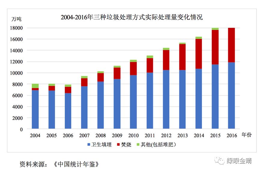 垃圾处理有三种形式:填埋焚烧及其它(堆肥等)。受制于城市土地资源限制,焚烧是其中增长最快的处理方式,2004-2016 年,焚烧复合增长率达 26.27% ,目前约占1/3份额。预计还有1倍增长空间。根据中国固废网 E20 研究院测算,到2020 年,我国垃圾焚烧处理率将达到 50%,市场投资空间、建设空间约在 1,000 亿元左右。